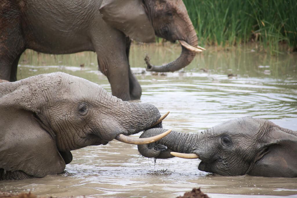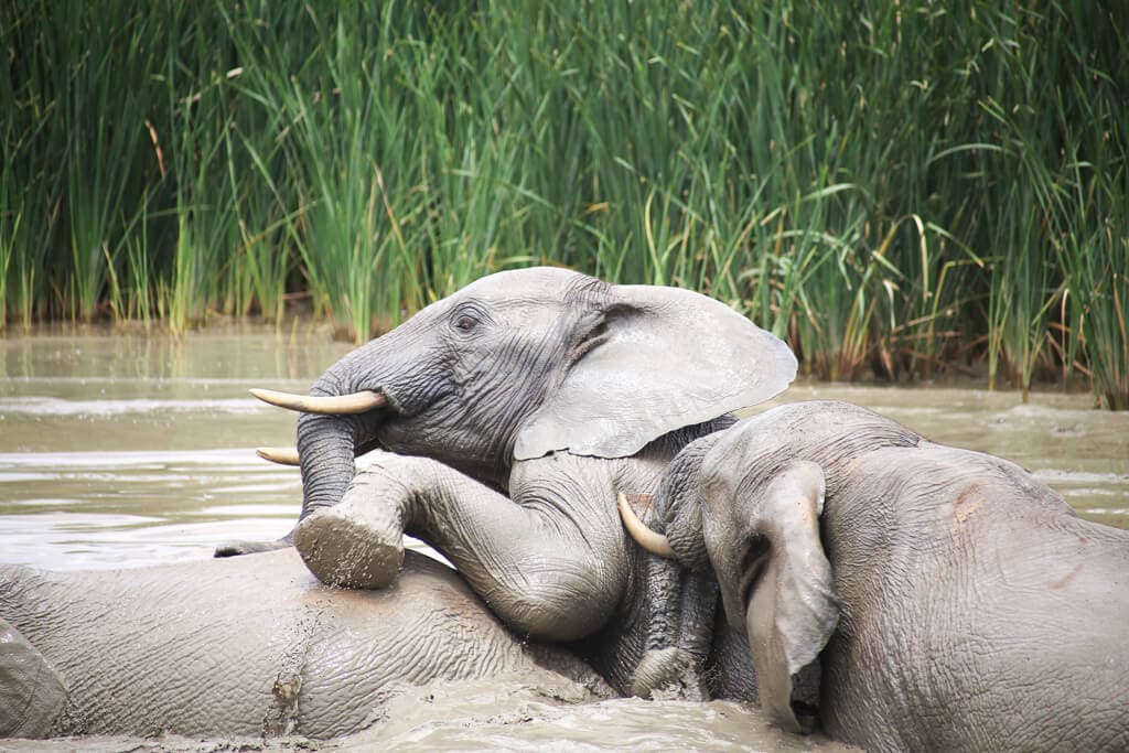 Adolescent elephants slid into the water and swam, splashed and play-fought.