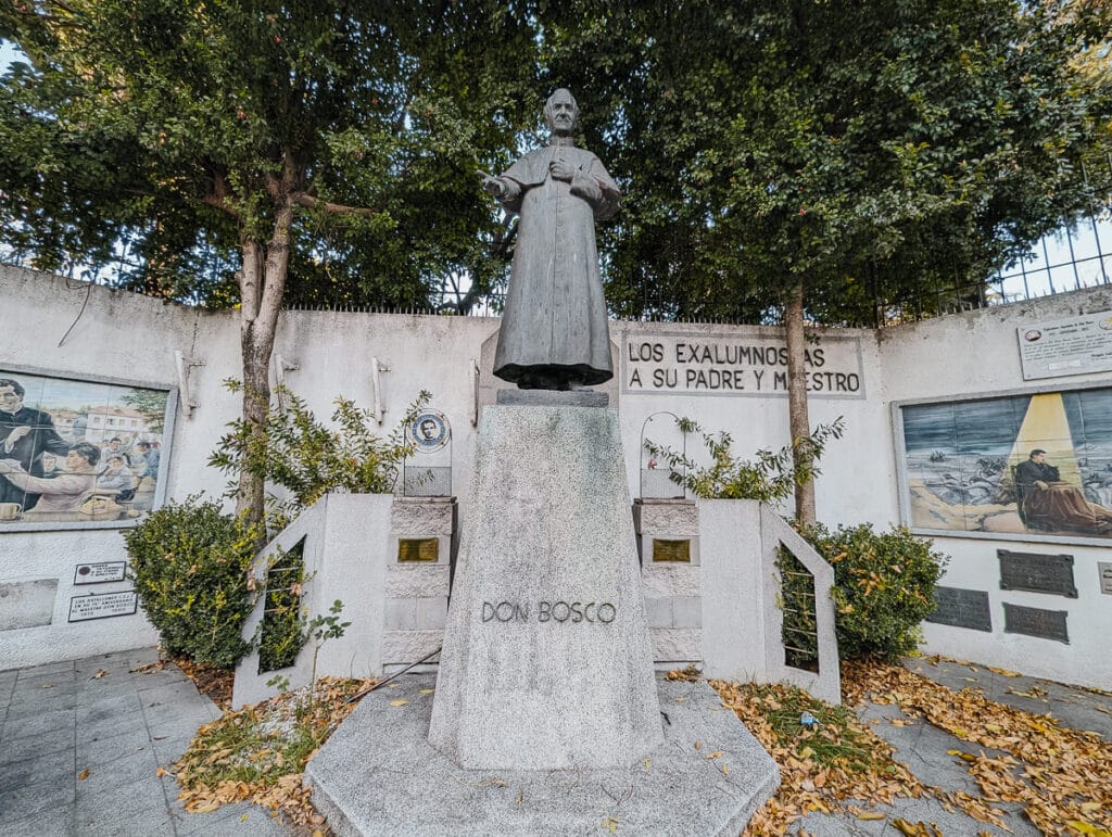 On the street corner behind a gate you’ll see a statue of Don Bosco, founder of Society of Saint Francis de Sales (also referred to as the Salesians of Don Bosco).