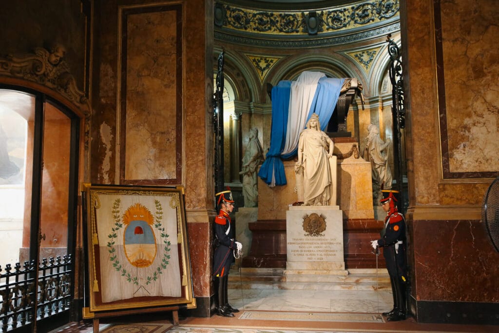 Outside the entrance burns the eternal flame for the unknown soldier and General San Martin.