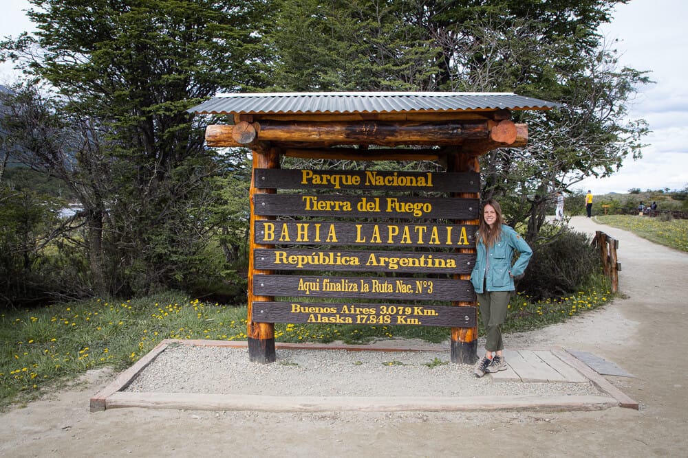 At the end of Ruta 3 take a picture with the sign commemorating the moment, marking the distance from Buenos Aires and even further, Alaska.